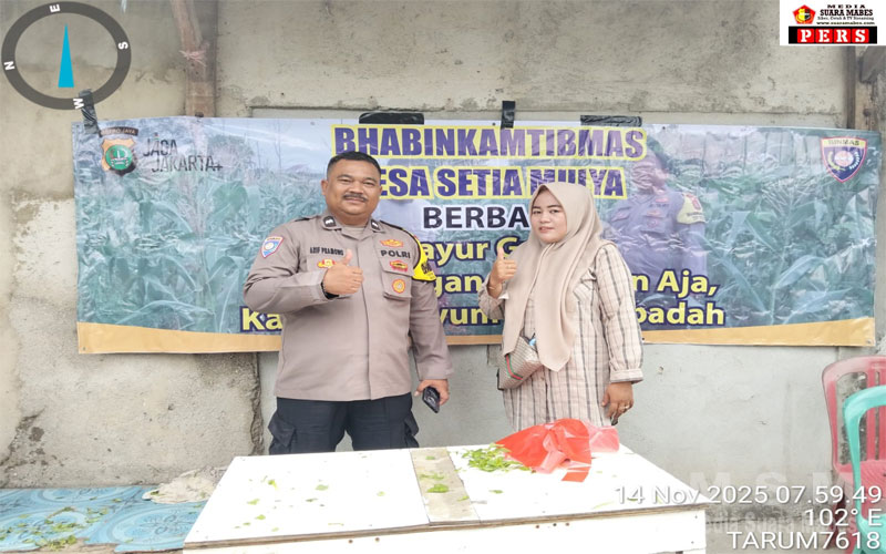 MediaSuaraMabes, Bekasi – Dalam rangka kegiatan Jumat Berkah, Babinkamtibmas Desa Setiamulya Aipda Arif Pramono mengadakan aksi sosial dengan membagikan sayur mayur gratis kepada warga Kampung Tanggul haji Samsuri RT 02 RW 011, Jumat (14/11/2025).