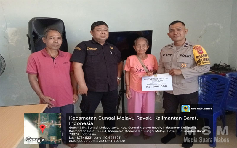 MediaSuaraMabes, Ketapang Kalbar – Dalam upaya mendukung kelancaran dan transparansi program bantuan pemerintah, Kapolsek Tumbang Titi IPTU Made Adyana, melalui Bhabinkamtibmas Aipda M. Aziz, melaksanakan pendampingan penyaluran Bantuan Langsung Tunai (BLT) bulan Juli 2025 di Desa Jairan Jaya, Kecamatan Sungai Melayu Rayak, Kabupaten Ketapang.