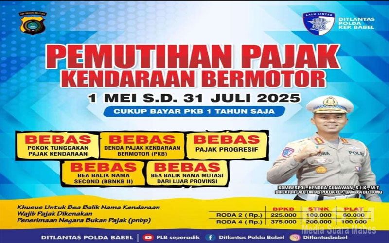 MediaSuaraMabes, Babel – Dir Lantas Polda Bangka Belitung,Kombes.Pol Hendra Gunawan mengajak seluruh masyarakat untuk memanfaatkan program pemutihan pajak kendaraan bermotor (PKB).