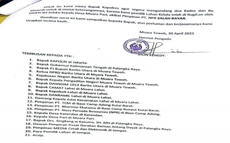 Dalam laporan sebelumnya Jhon Kenedy salah seorang ketua LSM Lembaga Pemantau Kebijakan Publik (LPKP) Barito Utara 2/5/2025 menyampaikan, “Seminggu sebelumnya saya sudah menyampaikan laporan melalui SPKT Polres Barito Utara sebagaimana surat kami Nomor:022/DPP-LPKP/KTG/IV/2025 Dengan Perihal: Pengaduan Dugaan Tindak Pidana Penggelapan HAK karena sudah lebih dari seminggu belum ada respon maka kemaren kembali kami sampaikan kembali surat Nomor:023/DPP-LPKP/KTG/IV/2025 Perihal: Kompirmasi Tentang Pengaduan, Adapun yang kami laporkan yaitu 2 Oknum Kepala Desa yang bersangkutan dan satu orang inisial (M) atau salah satu masyarakat yang berasal dari kabupaten Barito Utara menjadi anggota DPRD di Kubar (Kaltim) Karena kalau dibilang uang tersebut untuk pembebasan lahan, sepengetahuan kami ada mereka tidak memiliki hak kelola yang nyata pada lahan 190 Ha. Yang katanya dianggarkan rencana pemberian taliasih oleh PT. NPR. Kata Jhon Kenedy