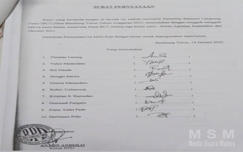10 orang warga Bambung Timur yang merupakan penerima BLT menyatakan belum menerima BLT tersebut melalui surat pernyataan.