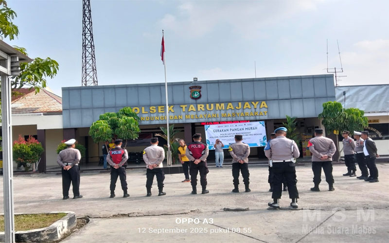 MediaSuaraMabes, Tarumajaya – Mapolsek Tarumajaya bersama Pemerintah Kabupaten Bekasi menggelar Gerakan Pangan Murah sebagai upaya menekan inflasi sekaligus membantu masyarakat dalam memenuhi kebutuhan pokok sehari-hari. Kegiatan tersebut berlangsung di halaman Mapolsek Tarumajaya, Jumat (12/September/2025).