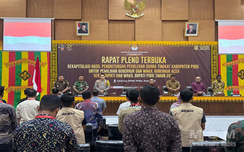 MediaSuaraRakyat (MSM Network), Sigli – Kapolres Pidie AKBP Jaka Mulyana, SIK, MIK menghadiri rapat pleno terbuka rekapitulasi hasil penghitungan perolehan suara tingkat kabupaten Pidie pada Pilkada tahun 2024, yang dilaksanakan oleh Komisi Independen Pemilihan (KIP) Kabupaten Pidie.