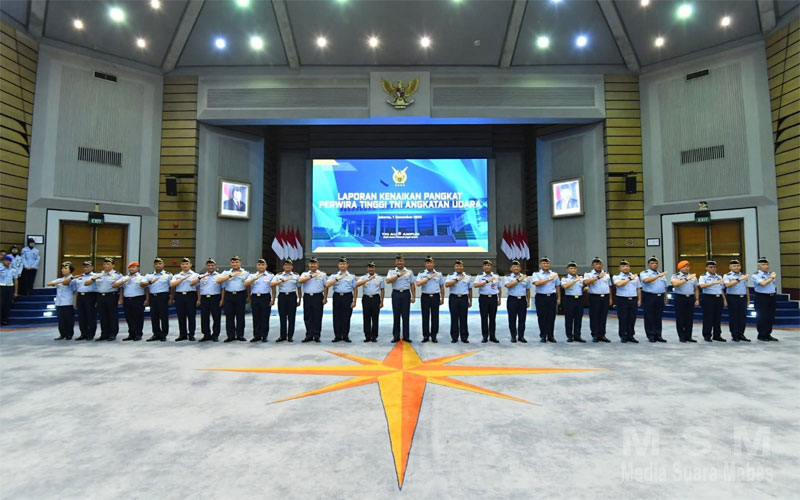 MediaSuaraMabes, Jakarta – Kepala Staf Angkatan Udara (Kasau) Marsekal TNI M. Tonny Harjono, S.E., M.M. menerima laporan kenaikan pangkat (Kenkat) 25 perwira tinggi (Pati) TNI AU di Auditorium I.G. Dewanto, Mabesau, Cilangkap, Jakarta Timur, Senin (1/12/2025).