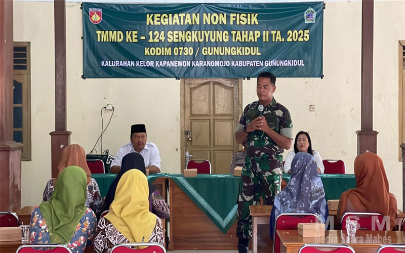 MediaSuaraMabes, Gunungkidul – Selain menggelar kegiatan fisik berupa pembangunan insfrastruktur, Tentara Manunggal Membangun Desa (TMMD) Sengkuyung Ke 124 Tahap II Tahun Anggaran 2025 Kodim 0730/Gunungkidul melaksanakan kegiatan non fisik dengan berbagai materi penyuluhan di antaranya, Penyuluhan Wawasan Kebangsaan dan Bela Negara dari Kodim 0730/Gunungkidul, Penyuluhan Kamtibmas dan Sadar Hukum dari Polres/Polsek Gunungkidul, Penyuluhan Pencegahan penyakit pada hewan ternak (PMK) dari Puskeswan Karangmojo, Penyuluhan KB Kesehatan dan pencegahan Stunting dari Klinik Kartika 0730, kegiatan non fisik dengan penyuluhan Bela Negara dan Wawasan Kebangsaan yang dilaksanakan bertempat di Balai Padukuhan Ngunut Lor, Kalurahan Kelor, Kapanewon Karangmojo, Kabupaten Gunungkidul, Rabu(21/05/2025).