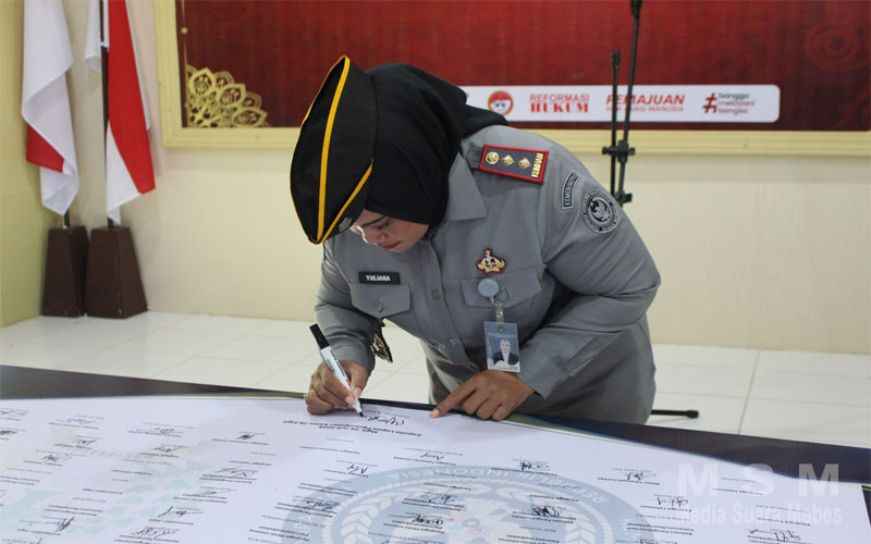 MediaSuaraMabes, Sigli – Lembaga Pemasyarakatan (Lapas) Perempuan Kelas IIB Sigli hari ini, Selasa (29/07) secara resmi mendeklarasikan dan menandatangani komitmen bersama “Zero HALINAR” (Handphone, Pungutan Liar, dan Narkoba). Deklarasi yang dipimpin langsung oleh Kepala Lapas Perempuan Kelas IIB Sigli, Yuliana diikuti oleh pejabat struktural dan seluruh pegawai Lapas Perempuan Kelas IIB Sigli.