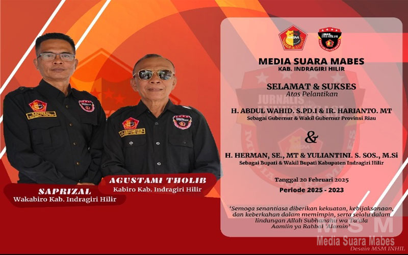 MediaSuaraRakyat (Jaringan MSM), Kab. Indragiri Hilir – Media Suara Mabes Kabupaten Indragiri Hilir mengucapkan selamat dan sukses atas pelantikan H. Abdul Wahid, S.Pd.I dan Ir. Harianto, MT sebagai Gubernur dan Wakil Gubernur Provinsi Riau.