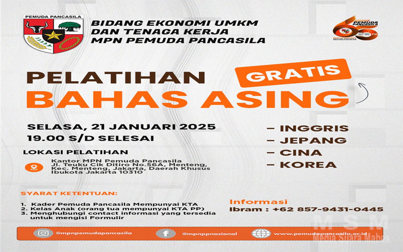 MediaSuaraRakyat (Jaringan MSM), Jakarta – MPN Pemuda Pancasila melalui Bidang Ekonomi UMKM dan Ketenagakerjaan mengadakan pelatihan bahasa asing sebagai bagian dari upaya peningkatan kapasitas kader. Pelatihan ini bertujuan untuk membekali para kader dengan keterampilan bahasa yang dapat menunjang perkembangan ekonomi dan peningkatan daya saing di pasar global. Bahasa yang dipelajari dalam pelatihan ini meliputi bahasa Inggris, Jepang, China, dan Korea, yang sangat relevan dengan berbagai peluang di sektor ekonomi dan ketenagakerjaan.