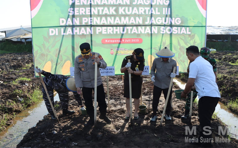 MediaSuaraMabes, Ketapang Kalbar – Kapolres Ketapang Polda Kalbar AKBP Setiadi, S.H., S.I.K., M.H., bersama jajaran forkopimda Kabupaten Ketapang melaksanakan penanaman bibit jagung serentak Kuartal III. Kegiatan penanaman bibit jagung tersebut digelar di area lahan Kawasan Industri Ketapang Ecology and Agriculture Forestry Industrial Park di Desa Sungai Awan Kanan Kecamatan Muara Pawan Kabupaten Ketapang, pada Rabu (09/07/2025) Pukul 14.00 Wib.