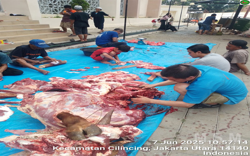 MediaSuaraMabes, Rorotan — Kegiatan penyembelihan hewan kurban di Masjid Al Barkah, Rusunawa Rorotan, Jakarta Utara, berlangsung dengan lancar dan penuh semangat gotong royong. Tahun ini, panitia kurban berhasil menyembelih sebanyak 2 ekor sapi dan 11 ekor kambing yang merupakan sumbangan dari warga, Babek TNI, serta sejumlah donatur lainnya.