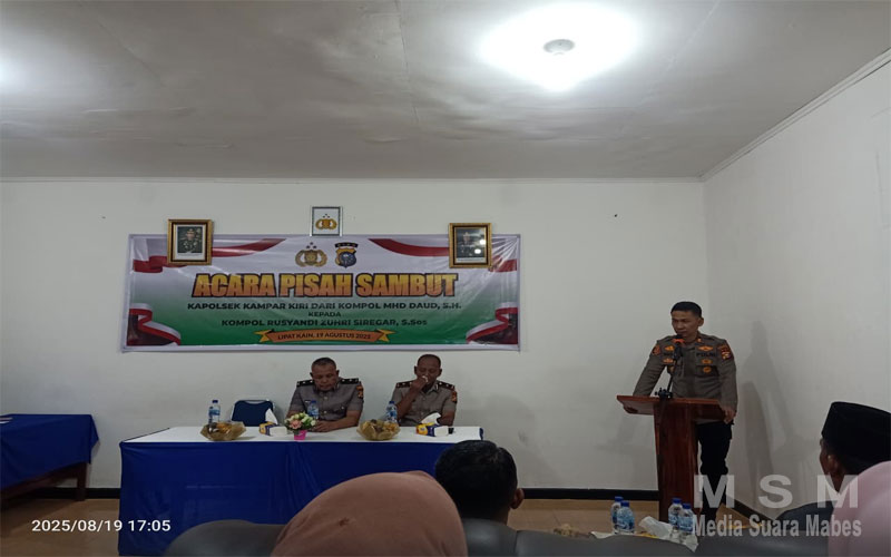 MediaSuaraMabes, Kampar Kiri Kab Kampar – Pada Selasa, 19 Agustus 2025, Polsek Kampar Kiri menggelar acara pisah sambut Kapolsek Kampar Kiri dari Kompol Mhd Daud SH kepada Kompol Rusyandi Zuhri Siregar S.Sos dan Wakapolsek Kampar Kiri, Iptu Wahyu Saputra SH.