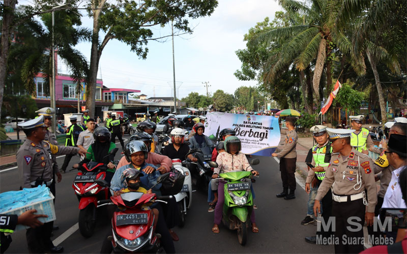 MediaSuaraRakyat, Beltim – Polres Belitung Timur membagikan helm berstandar Nasional Indonesia (SNI) kepada pengendara lalu lintas di Jalan Jend Sudirman Manggar tepatnya di Taman Kota Manggar Kabupaten Belitung Timur, Jumat (15/3/2024).