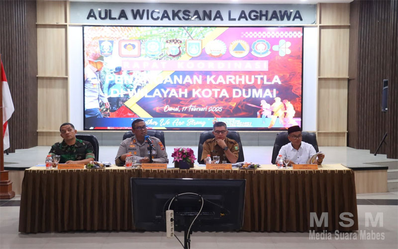 MediaSuaraRakyat (Jaringan MSM), Dumai – Polres Dumai menggelar rapat koordinasi penanganan kebakaran hutan dan lahan (Karhutla) di Aula Wicaksana Laghawa, Polres Dumai, Jalan Jenderal Sudirman, Kecamatan Dumai Timur. Rapat ini dihadiri oleh berbagai pihak terkait, termasuk jajaran pemerintahan, TNI-Polri, BPBD, serta perwakilan DPRD Kota Dumai.
