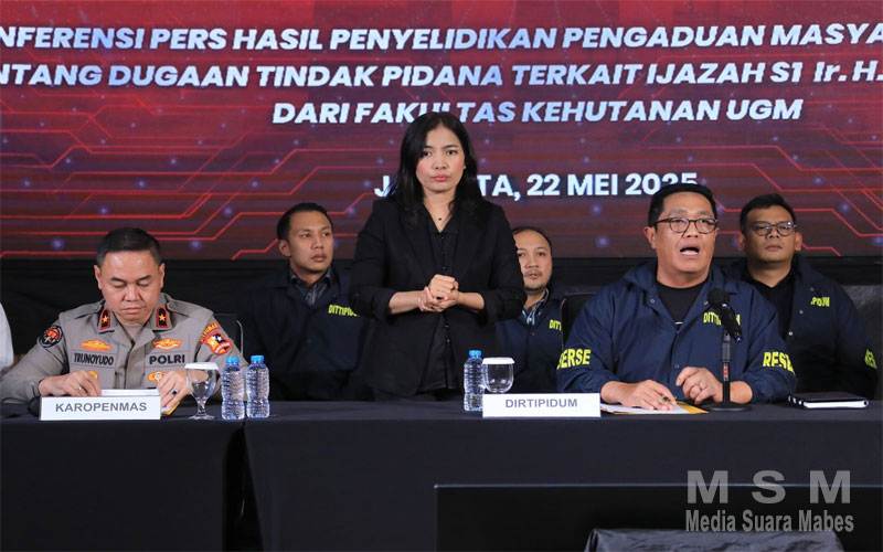 MediaSuaraMabes, Jakarta – Bareskrim Polri menegaskan bahwa dokumen ijazah Joko Widodo dinyatakan asli dan sah berdasarkan hasil penyelidikan dan uji forensik yang mendalam. Hal ini disampaikan dalam konferensi pers oleh Direktorat Tindak Pidana Umum (Dittipidum) Bareskrim Polri di Lobby Utama Gedung Awaloedin Djamin, Bareskrim Polri, Jakarta, Kamis (22/5).