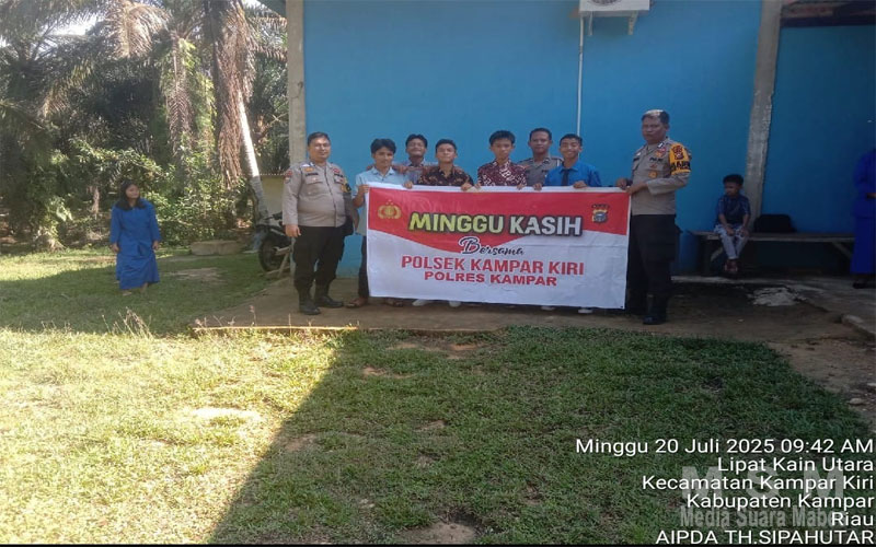 MediaSuaraMabes, Kampar – Dalam upaya meningkatkan kepercayaan publik dan mewujudkan keamanan dan ketertiban masyarakat (Harkamtibmas) yang kondusif, Polsek Kampar Kiri melaksanakan kegiatan “Minggu Kasih”. Minggu (20/7/2025), sekitar pukul 09.20 WIB, tiga personel Polsek Kampar Kiri, Aipda Th. Sipautar, Bripka Herman S., dan Bripka Jansen Nababan, melakukan kunjungan ke Gereja Gereja Protestan di Indonesia (GSPDI) Desa Sungai Paku untuk bertemu dan berinteraksi langsung dengan jema’at.