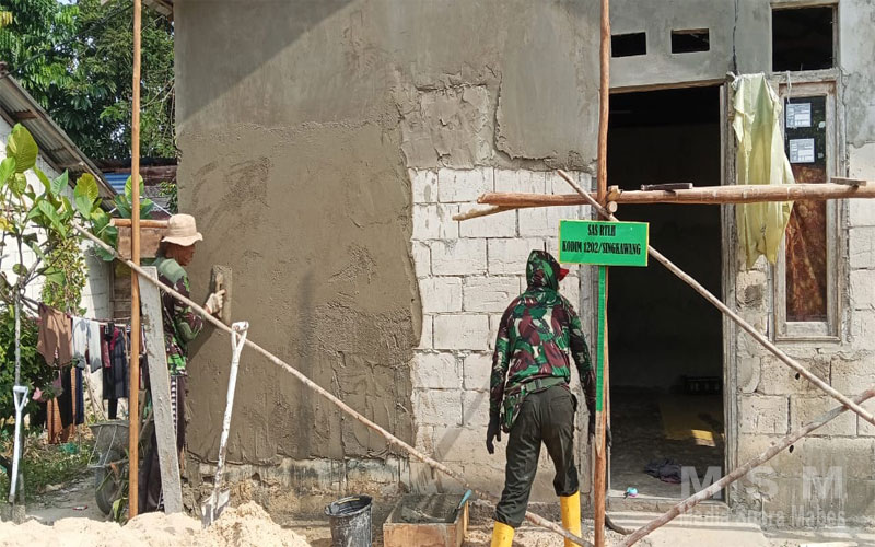 Rumah Bapak Bustami yang sebelumnya dalam kondisi tidak layak kini sedang dalam tahap renovasi total oleh personel Satgas dibantu masyarakat sekitar. Selain memperbaiki dinding dan atap, tim juga akan melakukan pembenahan lantai dan instalasi dasar lainnya agar rumah tersebut menjadi hunian yang sehat dan nyaman.
