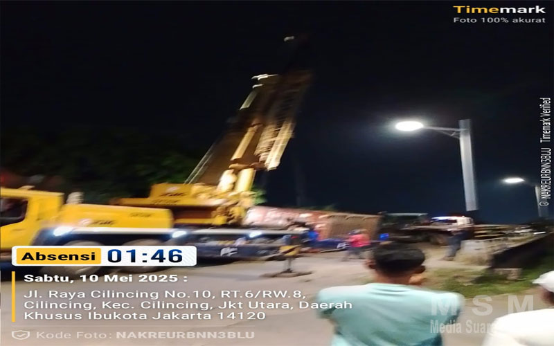 MediaSuaraMabes, Jakarta – Sebuah kecelakaan tunggal terjadi di Jembatan Kawasan Berikat Nusantara (KBN) Marunda, Jakarta Utara, pada Kamis malam (9/5) sekitar pukul 22.17 WIB. Sebuah truk trailer bernomor polisi B 9177 UEM yang membawa peti kemas berukuran 20 fit terguling saat menanjak, diduga akibat rem blong.